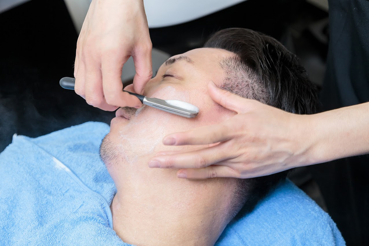 アロマの香りのするミストスチームをあてながらおこなうシェービングは、男性だけに与えられた極上の時間。